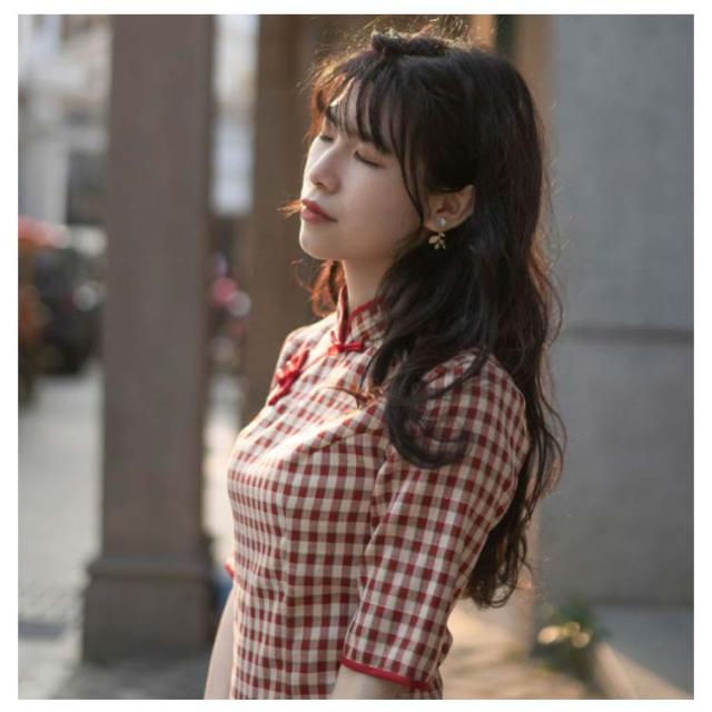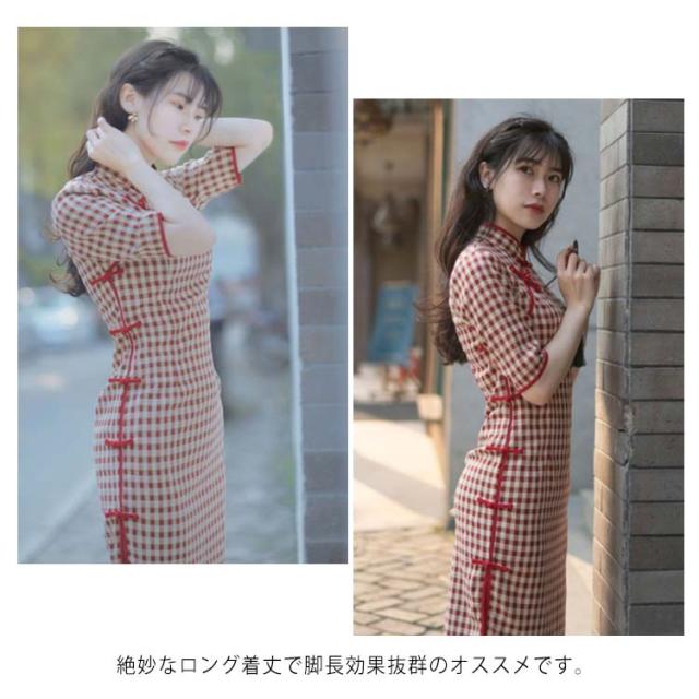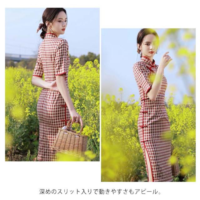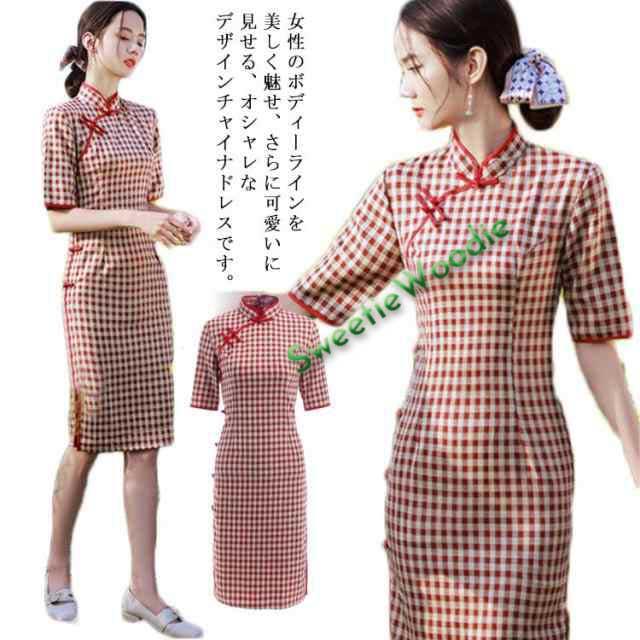 チャイナドレス チェック柄 綿麻 チャイナ風 ワンピース 半袖 ミディアム丈 ドレス パーティードレス 膝丈 チャイナ 大人 可愛い おしゃれ S M L XL 2XL 3XL 春 夏 秋 送料無料