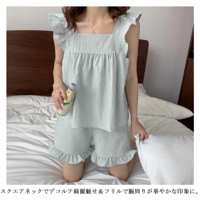 ルームウェア レディース 春夏 上下セット ノースリーブ トップス 短パン ショートパンツ キャミソール 部屋着 フリル 可愛い 大きいサイズ おしゃれ パジャマ 寝巻き ウエストゴム リラクシー プレゼント ナイトウェア ギフト 送料無料