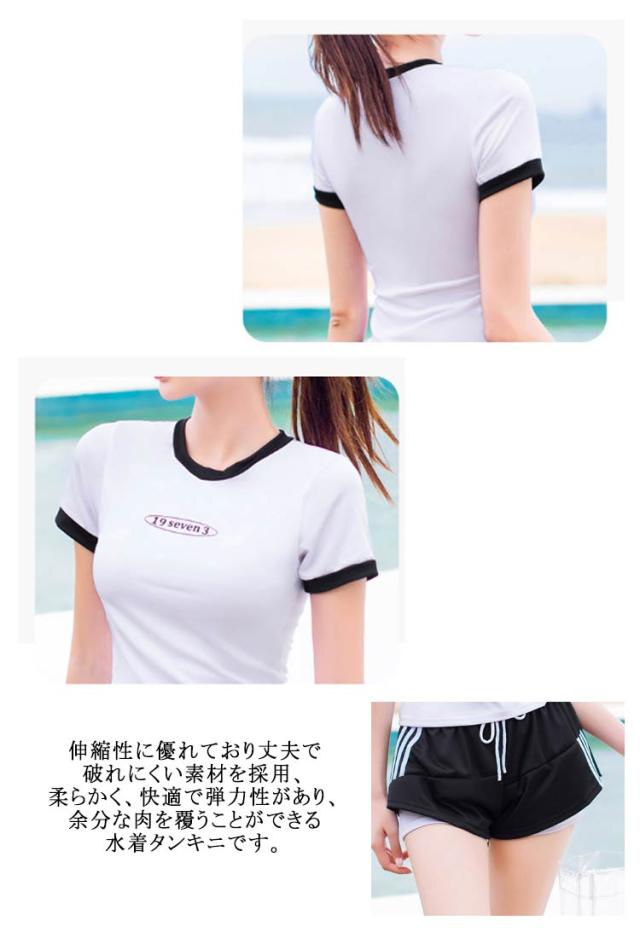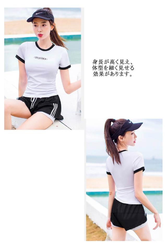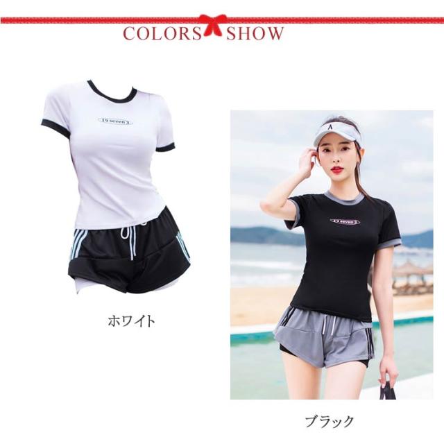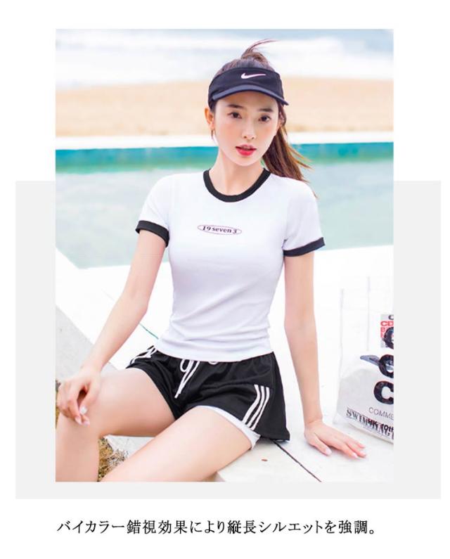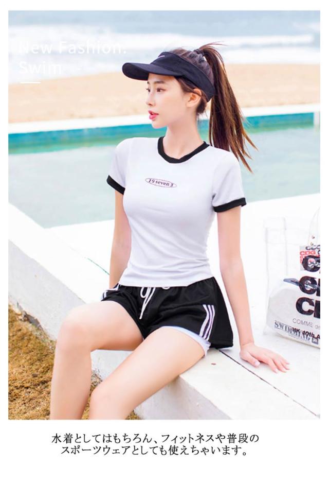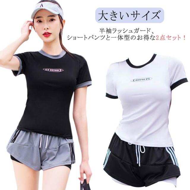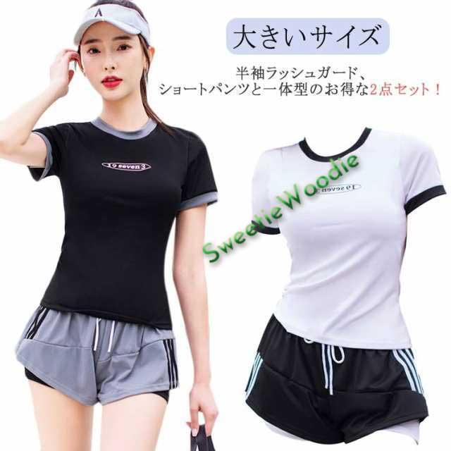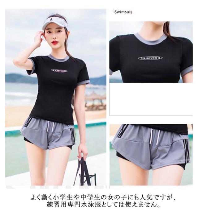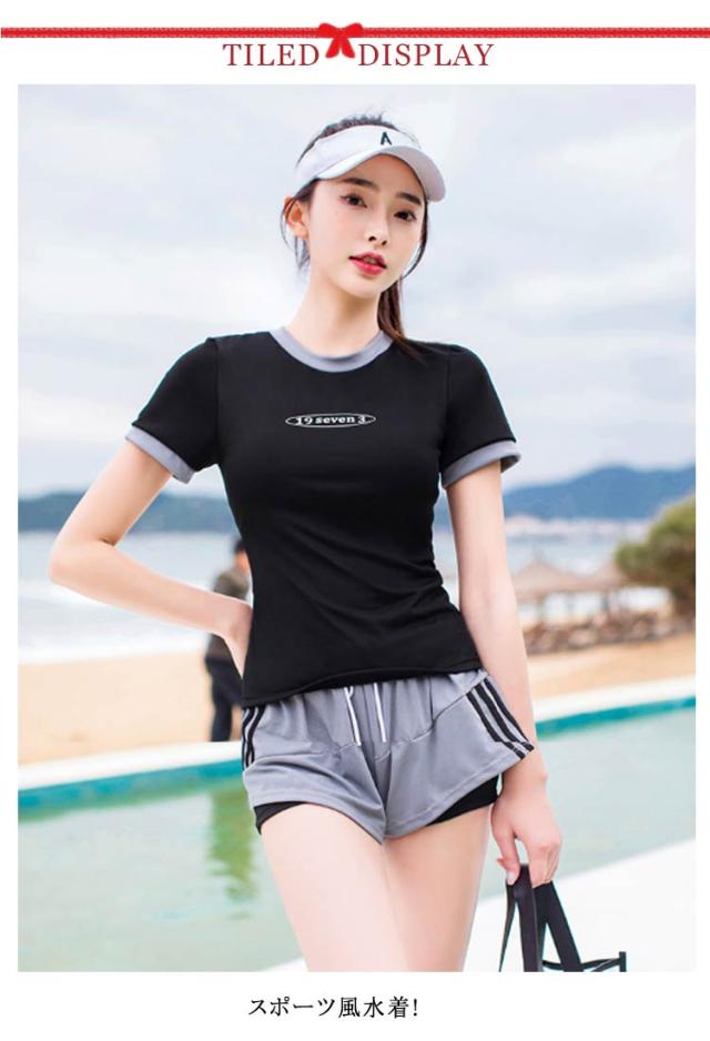 水着 レディース 女性 フィットネス水着 体型カバー 大きいサイズ セパレート 上下セット 2点 中学生 韓国風 大学生 夏 小胸 日焼け防止 レイヤード風 ショートパンツ ママ水着 水着 スクール水着 20代 30代