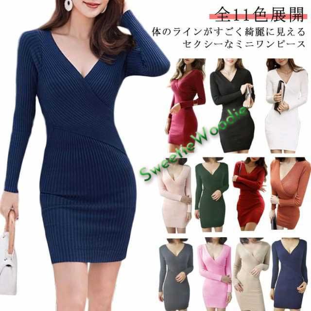 セクシー ワンピース ミニ丈 ニットワンピース Vネック タイトワンピース きれいめ フェミニン 姫系 長袖 タイト ショート丈 リブニット ミニワンピ パーティドレス お嬢様 セクシー キャバ嬢 デート服 キャバクラ キャバドレス 韓国 レディース 送料無料 フリーサイズ 無地