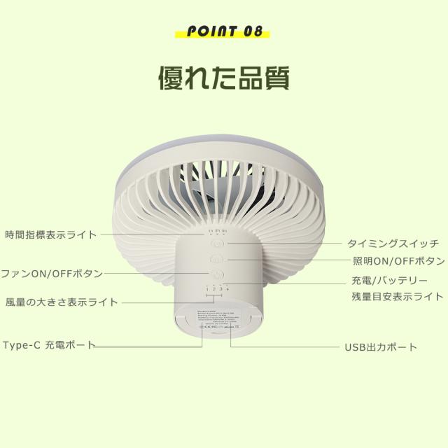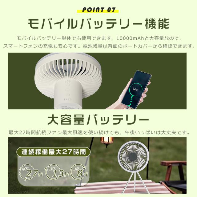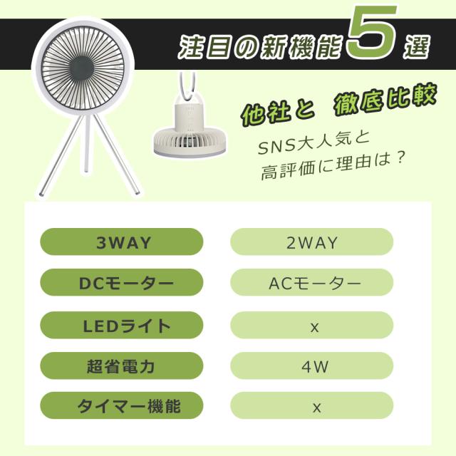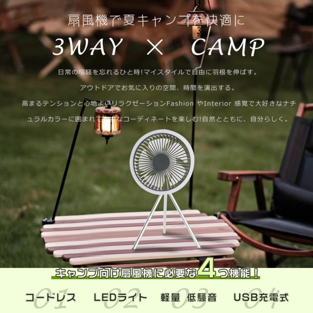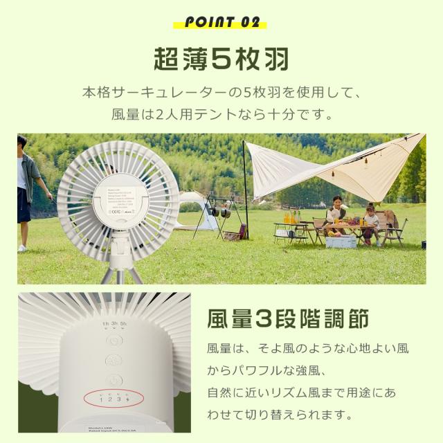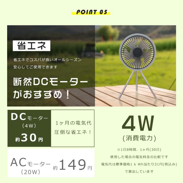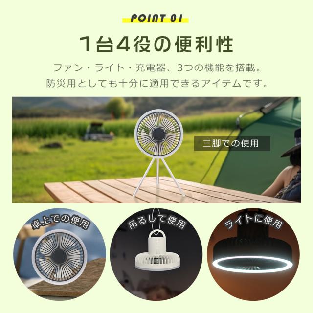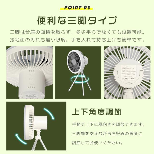 ★ リビング、サンルーム等での通常利用なもちろん、キャンプ、テントの場合、天井からぶら下げたり、吊り下げたりできます。三脚を外してテントの中で吊り下げて使えば、中の空気循環も可能。