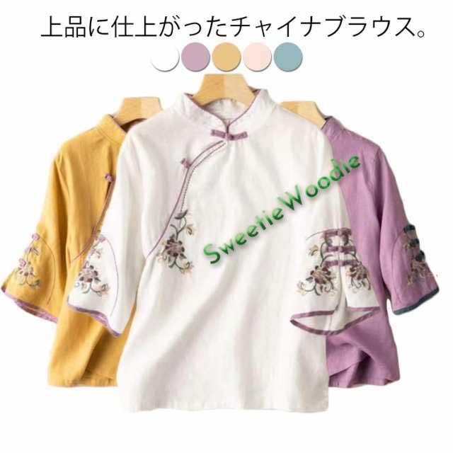 リンネルブラウス レディース 七分袖 プルオーバー 綿麻 チャイナブラウス 刺繍 ゆったり 薄手 着痩せ カジュアル シャツ トップス 夏 送料無料 立ち襟 エレガント レトロ