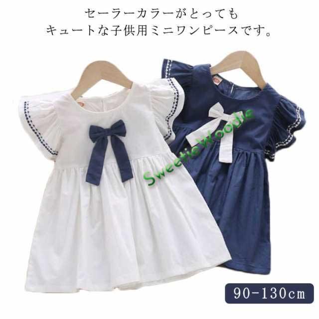 送料無料 ワンピース キッズ 子供服 女の子 90-130cm フリル袖 ノースリーブ セーラーカラー リボン 刺繍 ホワイト ネイビー ピンク かわいい おしゃれ 可愛い キュート 上品 清楚 キッズ服 ガールズ