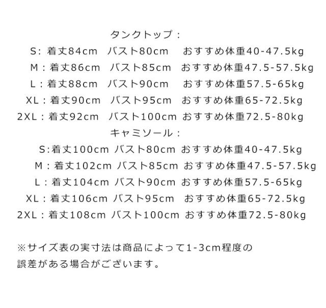 | サイズについての説明 | タンクトップ: S:着丈84cm バスト80cm おすすめ体重40-47.5kg M:着丈86cm バスト85cm おすすめ体重47.5-57.5kg L:着丈88cm バスト90cm おすすめ体重57.5-65kg XL:着丈90cm バスト95cm おすすめ体重65-72.5kg 2XL:着丈92cm バスト100cm おすすめ体重72.5-80kg キャミソール: S:着丈100cm バスト80cm おすすめ体重40-47.5kg M:着丈102cm バスト85cm おすすめ体重47.5-57.5kg L:着丈104cm バスト90cm おすすめ体重57.5-65kg XL:着丈106cm バスト95cm おすすめ体重65-72.5kg 2XL:着丈108cm バスト100cm おすすめ体重72.5-80kg ※サイズ表の実寸法は商品によって1-3cm程度の誤差がある場合がございます。 |
