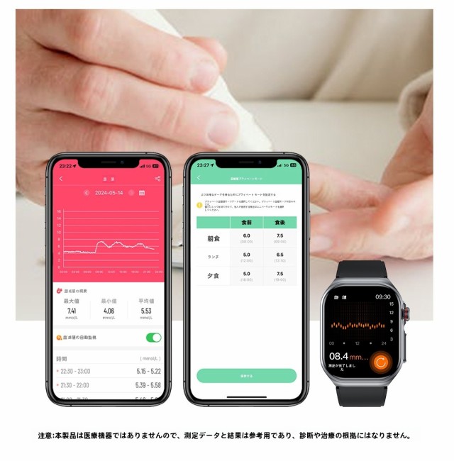 心拍数、血圧、血中酸素、体温および他の健康、遠距離でも家族や友人のための機能のリモートケア機能。