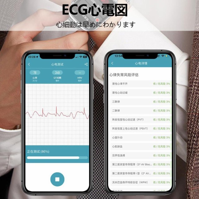 ECG心電図、血糖測定、血液成分、体組成分析、通話機能、心電図機能、血中脂質・尿酸測定