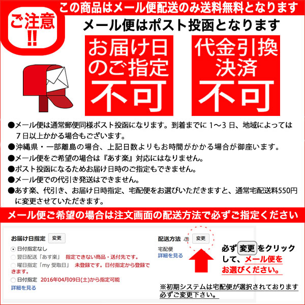 よびメール便送料無料の商品に関して、メール便での代引き発送はできませんのでご了承ください。代引き発送は運送便のみの対応になります。