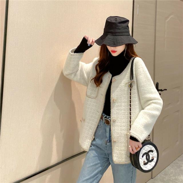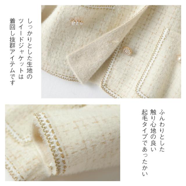 3B39ノーカラーツイードジャケット ニットジャケット レディース ふわっと触り心地の良い ツイード ホワイト ブラック 起毛 秋冬ジャケット フォーマル 卒業式 入学式 ママスーツ