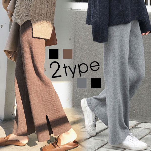 2A13 ニットワイドパンツ スリット レディースファッション 続々登場 グレースリット無 ブラックスリット無 ブラックスリット有 ブラウンスリット有