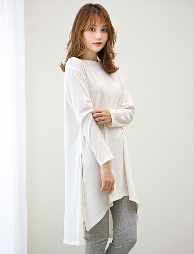 スキニージーンズやレギンスとも相性の良い、チュニック丈を採用しています。