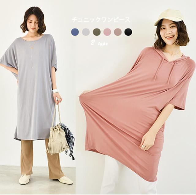 2A46チュニックワンピース レディース 2タイプ6カラーオーバーサイズ フード付き 大きいサイズ Tシャツ 半袖 ゆったり シンプル 無地 大人可愛いスリット