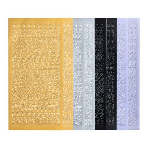 【数量】: 大文字--金、?、黒、白各1枚、小文字+数字--金、?、黒、白各1枚、合計8枚です。1枚あたり約260(大)/324(小)個のステッカーです。
