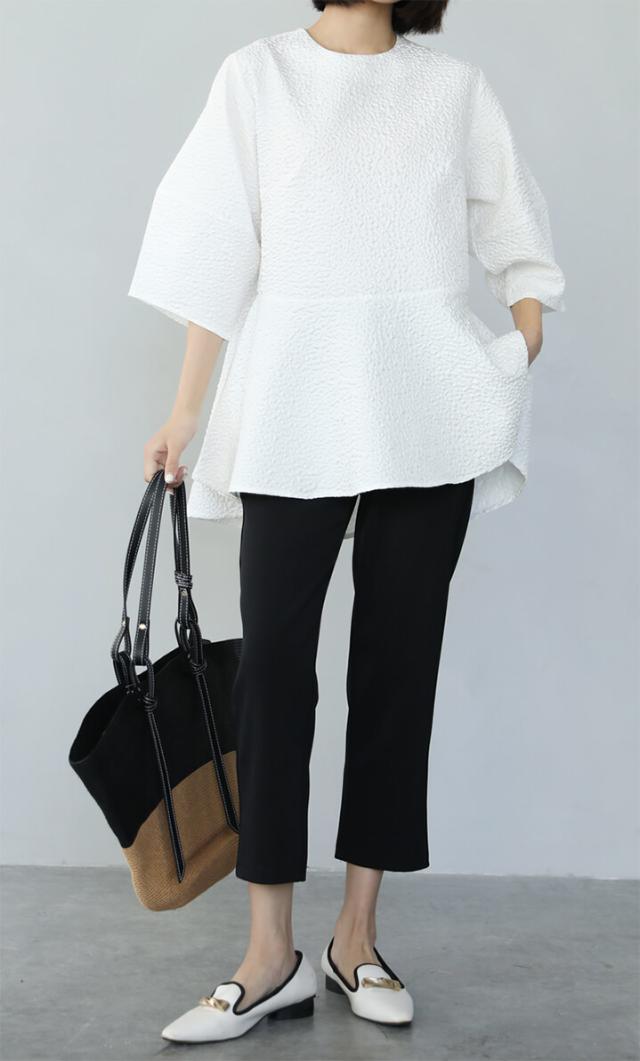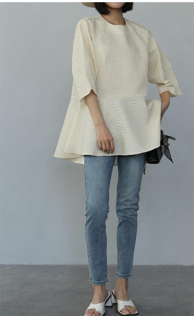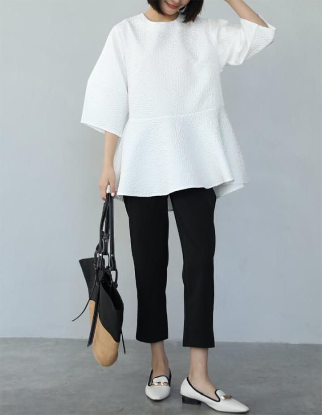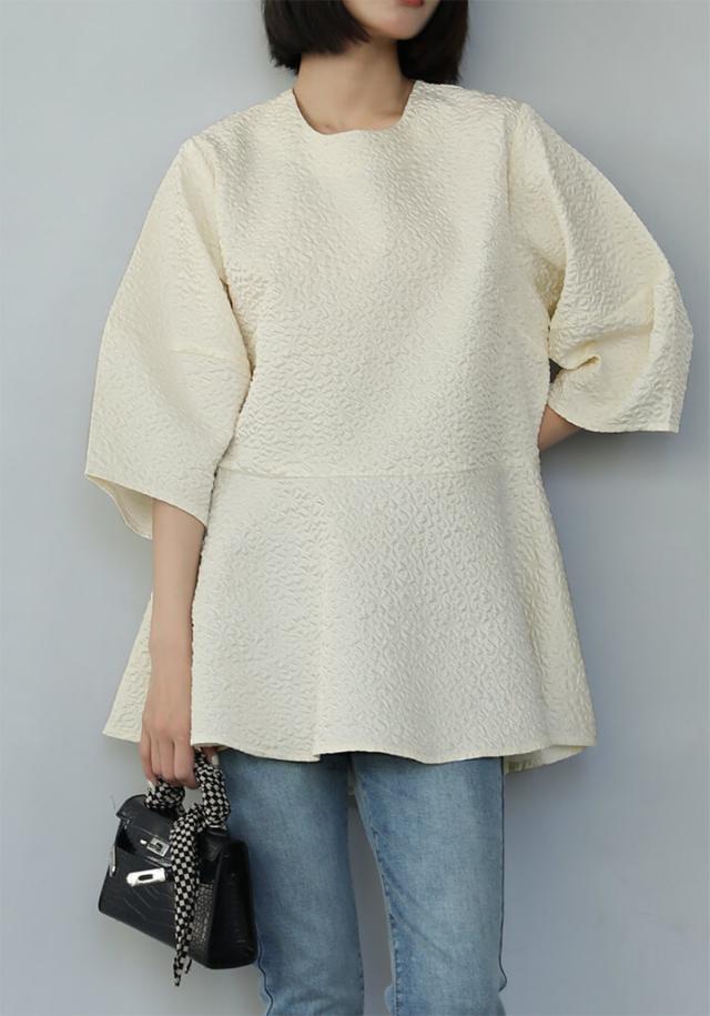 ふくれジャガードペプラムトップス ジャガードペプラムカットソー トップス 凹凸 レディース ブラウス半袖トップス半袖Tシャツ ゆったり Aライン 凹凸表面感 きれいめ 大人 体型カバー 上品