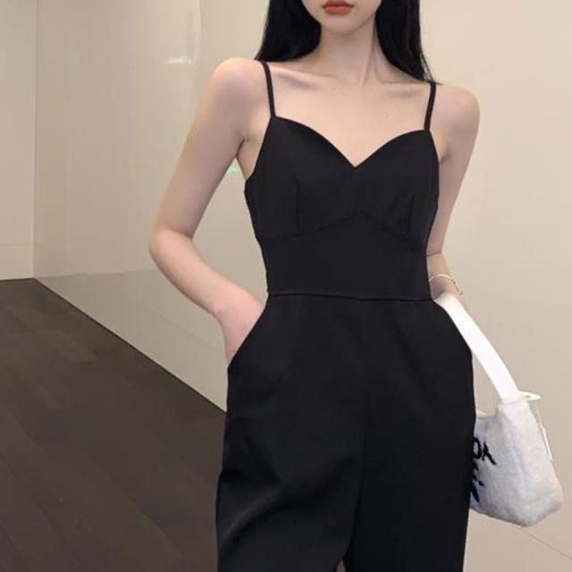 2A5 サスペンダー ジャンプスーツ レディース オールインワン スリム 春 夏 小さめ ハイウエスト カジュアル サロペット サロペットパンツ ワイドレッグ ブラック 黒 韓国ファッション きれいめ