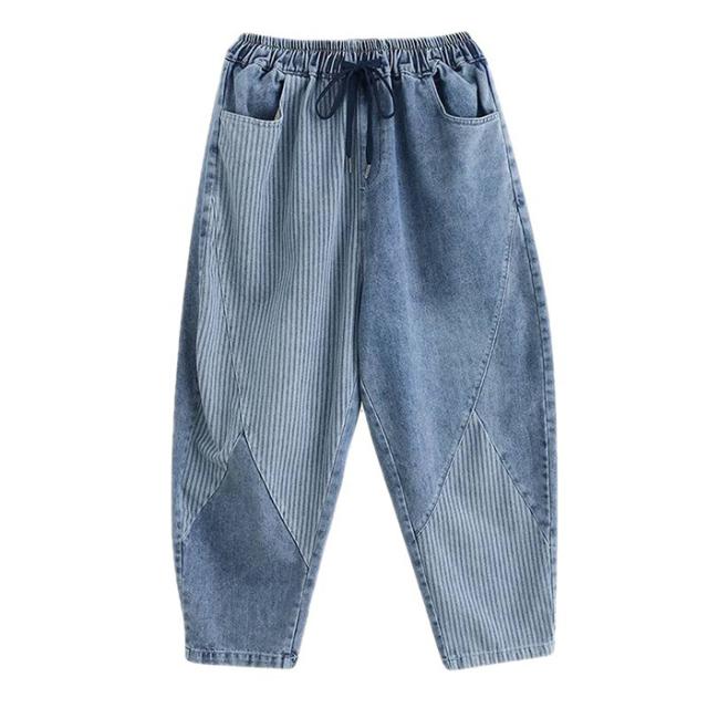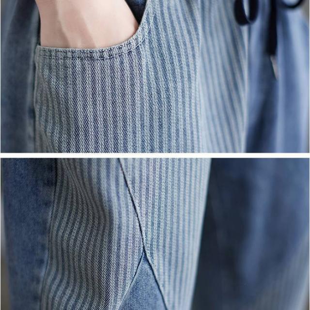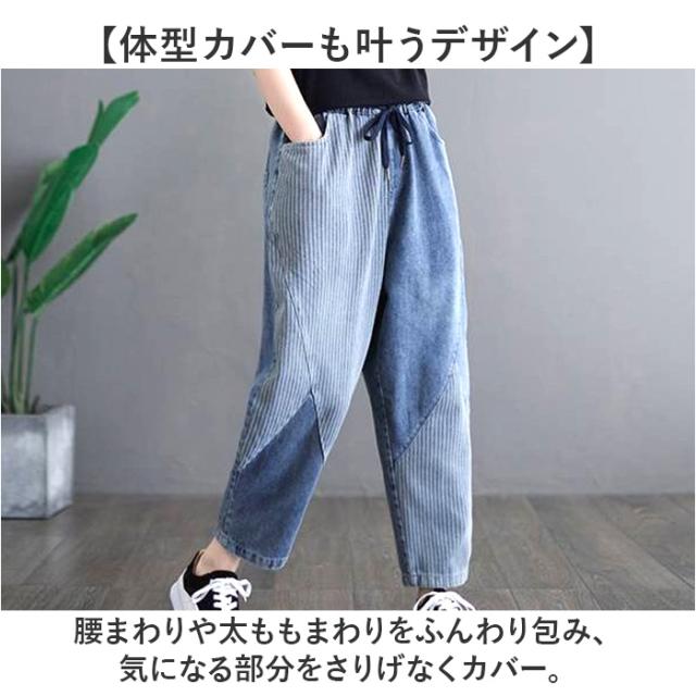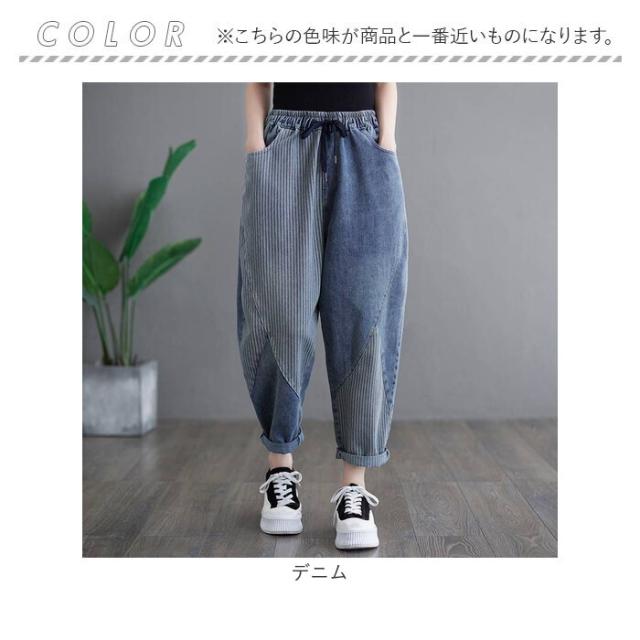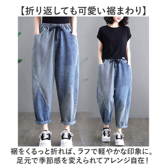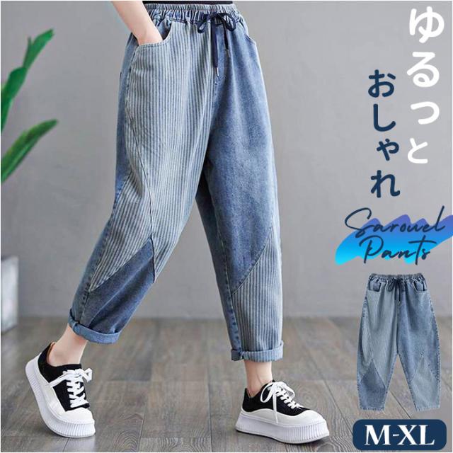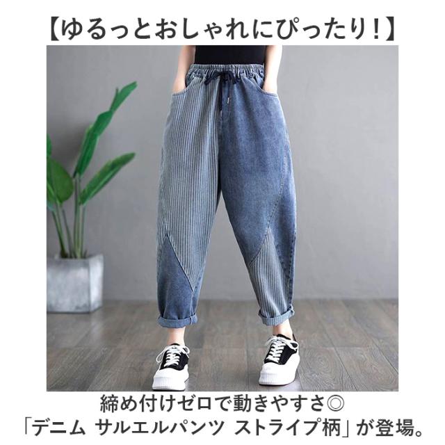 デニムパンツ レディース ストライプ 通販 サルエルパンツ ズボン パンツ ジーパン ジーンズ デニム サルエル レディースパンツ 9分丈 九分丈 ポケット ストライプ柄 ウエストゴム ゆったり 体型カバー カジュアル オールシーズン ボトムス