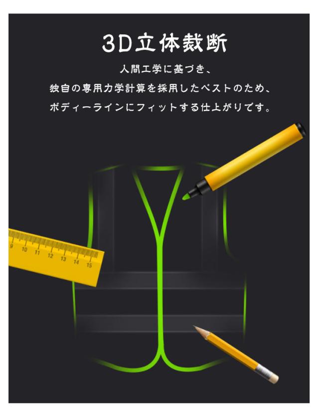 | (1)軽量性・通気性・耐久性・速乾性抜群 軽くて蒸れにくい、低ストレッチシルク素材を使用しています。それにより高い耐久性や断熱性も兼ね備えました。冬は温かく、夏は涼しい素材で、洗いやすく速乾性にも優れています。 (2)機能性抜群 光反射加工を施した光反射ボーダー付きのため、夜間でも高明瞭度の光反射で、全方向からあなたの安全をお守りします。 (3)防水性 防水加工を施しているため、濡れる作業や雨の日でも安心です。 (4)3D立体裁断 人間工学に基づき、独自の専用力学計算を採用したベストのため、ボディーラインにフィットする仕上がりです。 (5)収納便利 大ポケットが2つと小ポケットが1つあり、また、胸にはIDカードが収まるクリアポケットも完備しているため大変便利です。 (6)開閉しやすく、耐久性のあるファスナーを採用しています。 | |