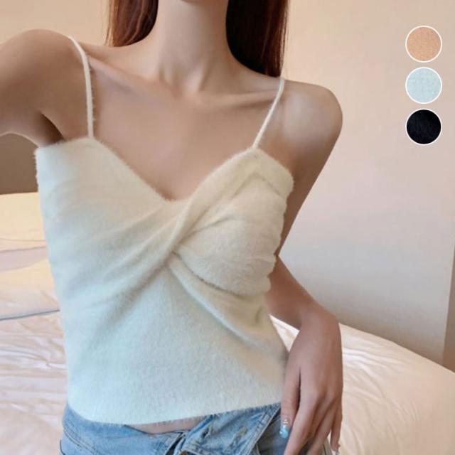 フロントクロス キャミソール レディース 春 夏 ノースリーブ ニット お洒落 可愛い もこもこ 毛皮 クロス結び インナー トップス ソフト 柔らかい キャミ アクリル 韓国ファッション カジュアル
