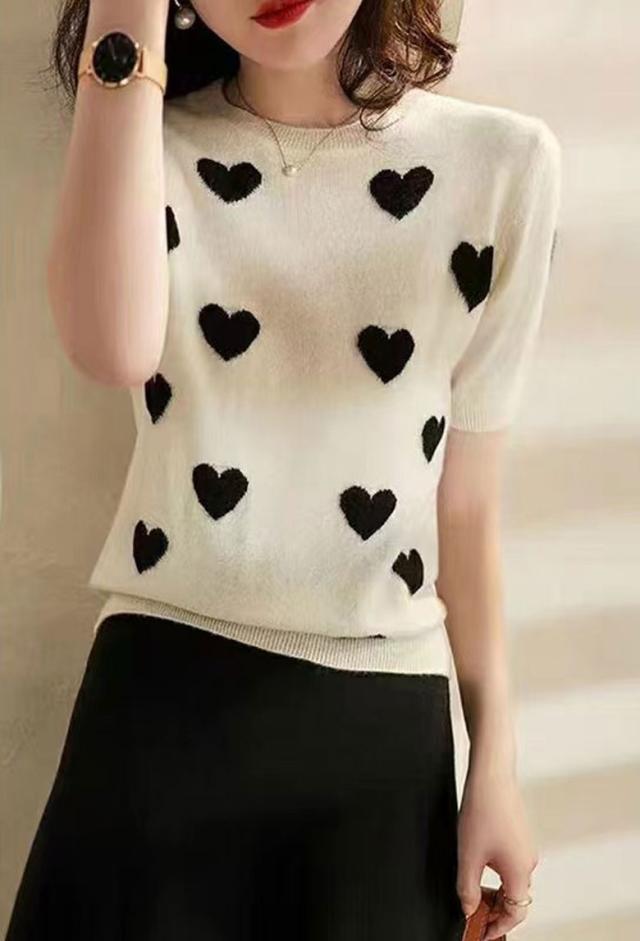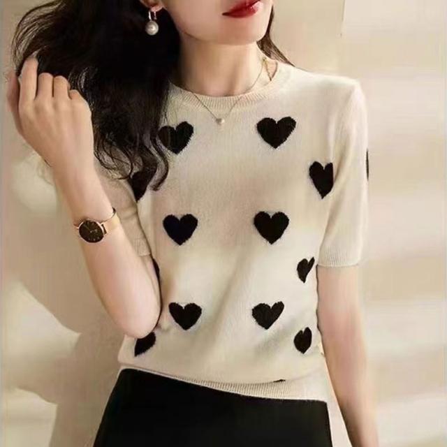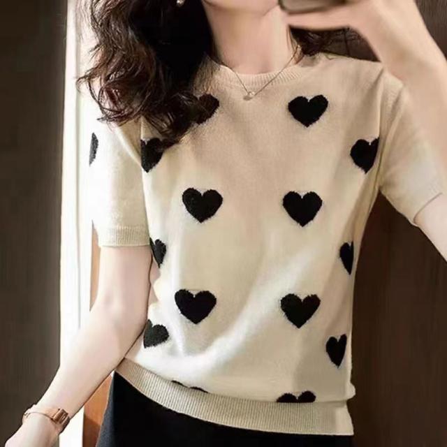 ハート柄 ニット セーター レディース 夏 半袖 トップス ニットセーター ハート アイスシルク 半袖ニット 半袖トップス お洒落 可愛い 韓国ファッション カジュアル
