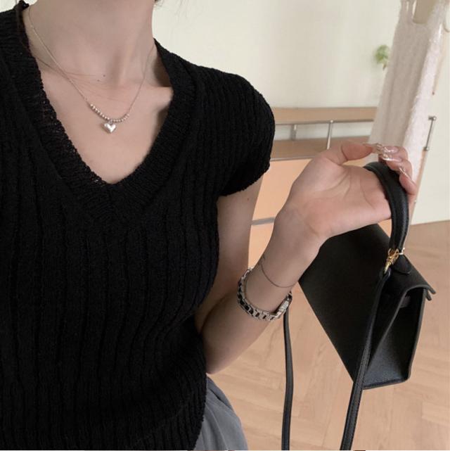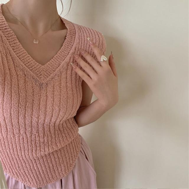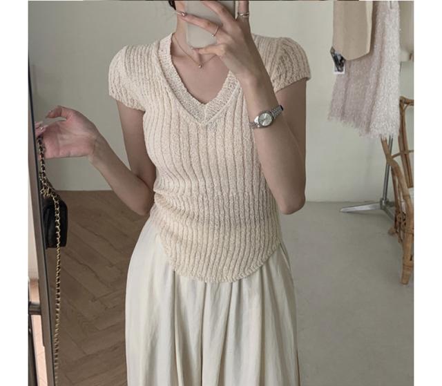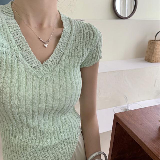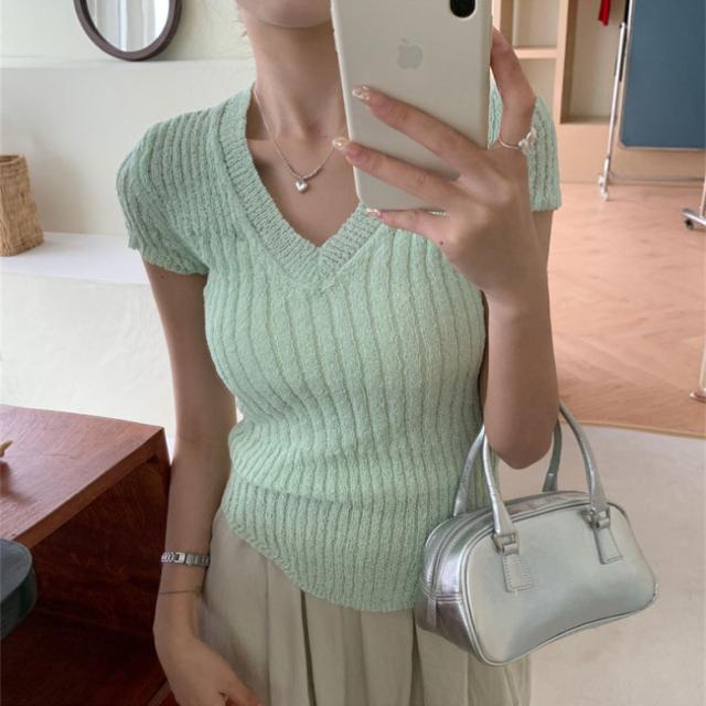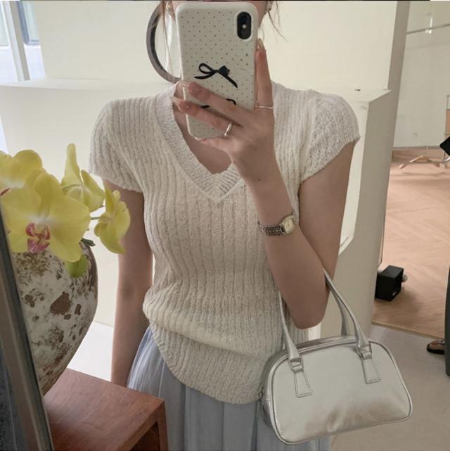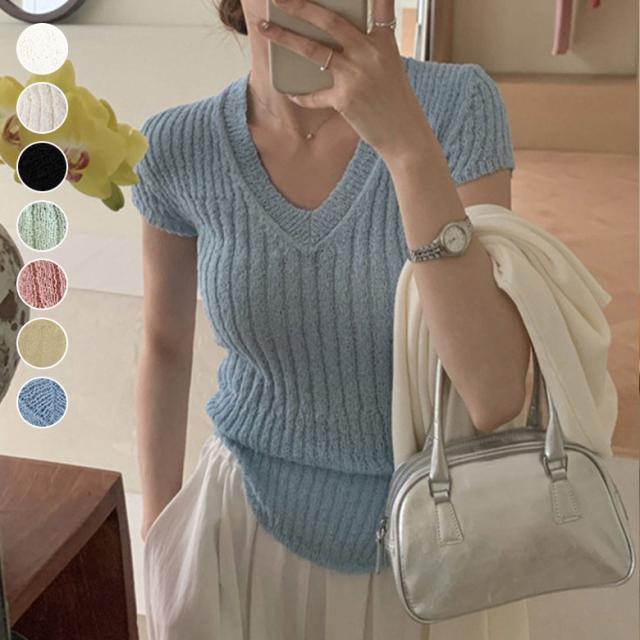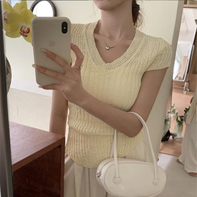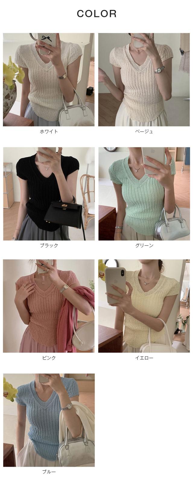 Vネック ニット セーター レディース 春 秋 トップス シンプル 無地 きれいめ ニットセーター 半袖 半袖ニット スリム 半袖セーター 韓国ファッション ニットトップス