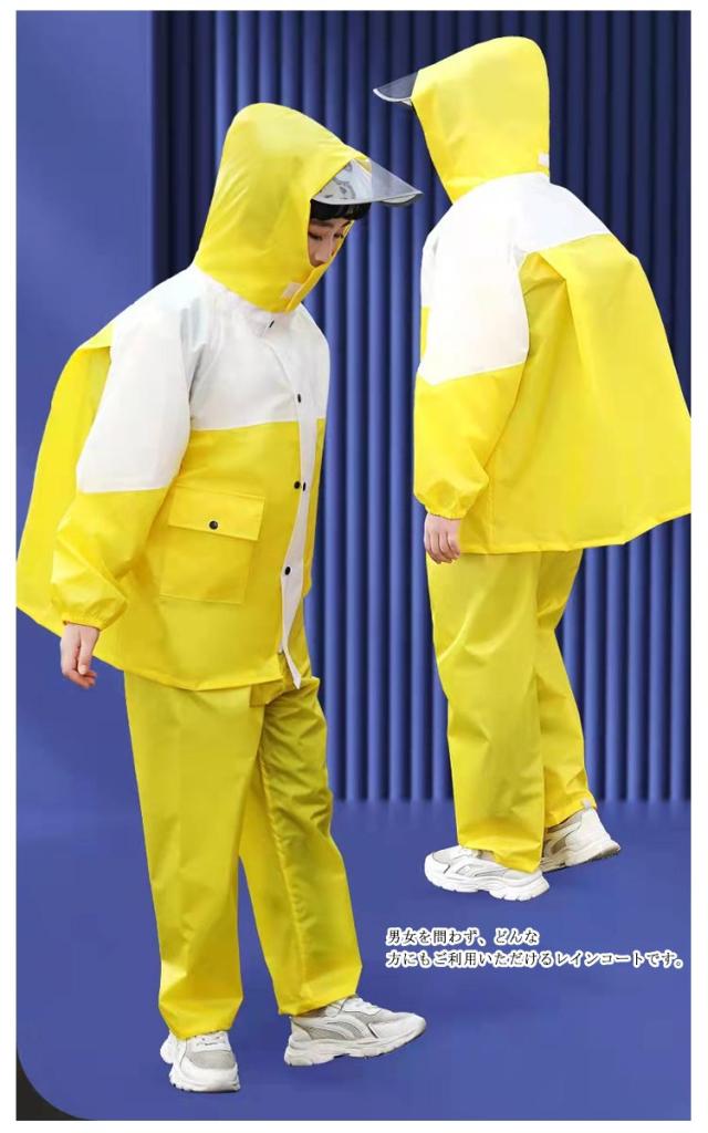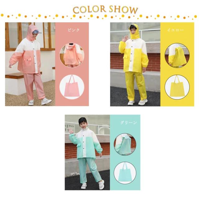 | 【子供レインコート】【上下セット】【115cm?165cm】【3color】【収納袋付き】 ・アウトドア・キャンプ・通学などの長時間の装着に最適です。 ・遠足や学校へ、災害時にも使えて便利! ・ランドセルやリュックの上からも着用可! ・雨よけのつばは透明なので視界良好◎深くかぶっても大丈夫。 ・雨天での運転でも顔が濡れづらく、しっかりと視界を確保してくれます。 ・反射板がついていて夜も安全に活動できます。 ・ズボンはウエストゴムで着脱楽ちん♪ ・ファスナーとスナップボタンで防水機能抜群。 ・耐久性に優れた素材を採用し、手触りはすべすべで触り心地がよく、丈夫で防水力も高いです。 ・収納袋は付いており、コンパクトに折りたたんで、カバーに入れればお持ち運びが便利となります。 ・男女を問わず、どんな方にもご利用いただけるレインコートです。 | |