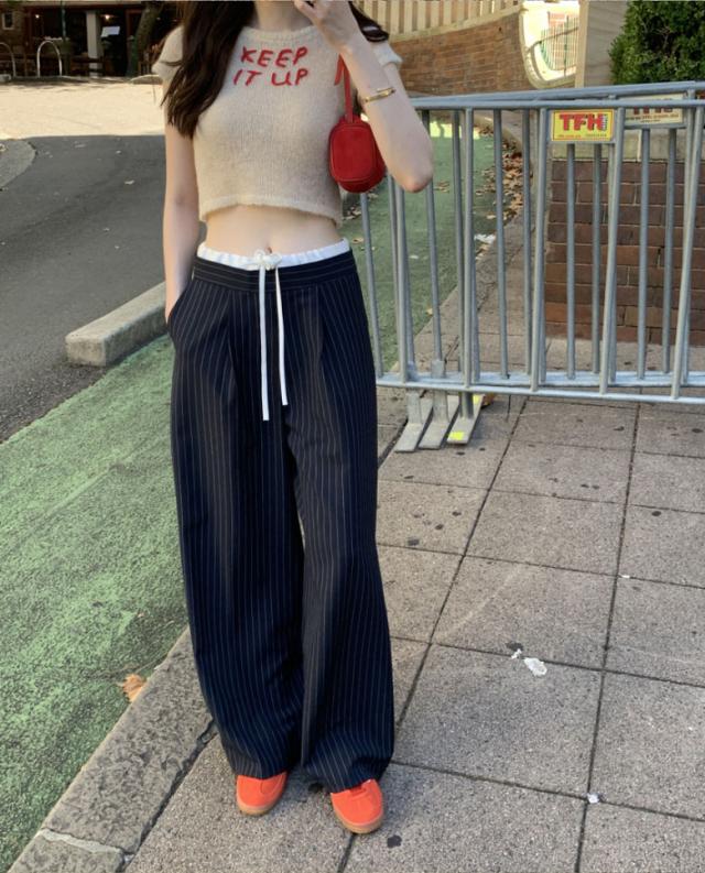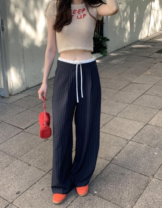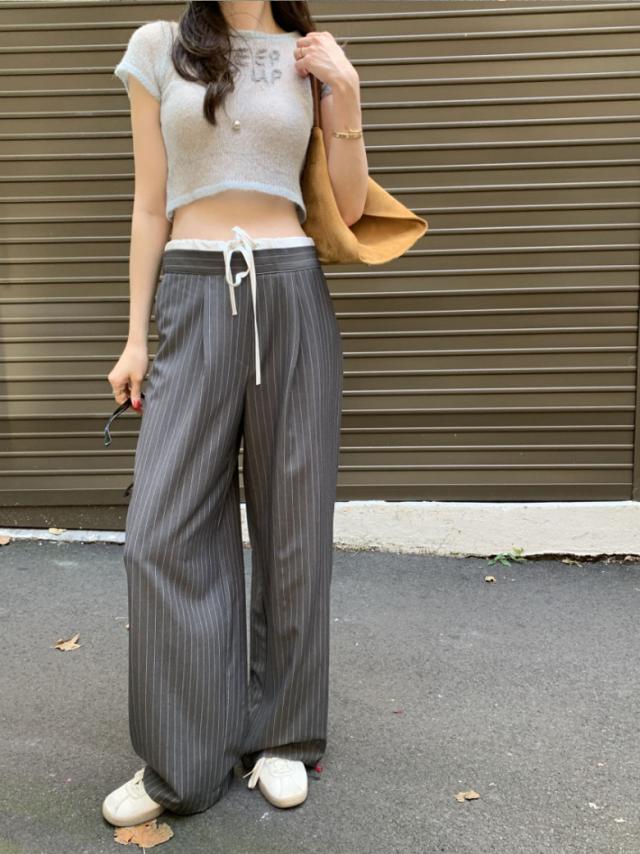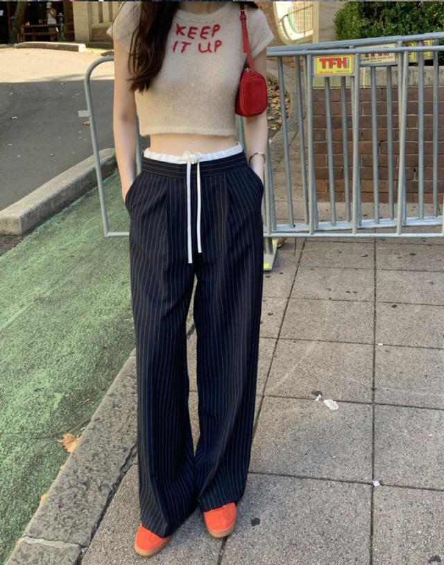 ストレート パンツ レディース 春 秋 レトロ きれいめ ハイウエスト カジュアルパンツ 通勤 オフィス OL ビジネス ストライプ ワイドパンツ ロングパンツ 韓国ファッション ワイドレッグ