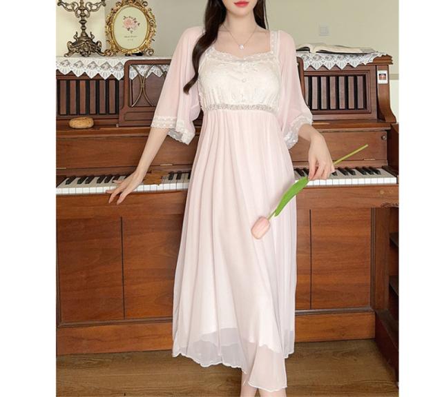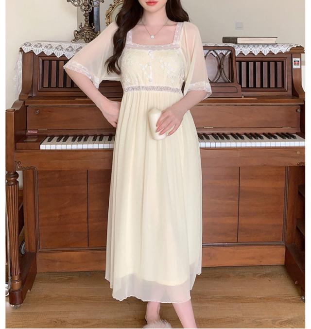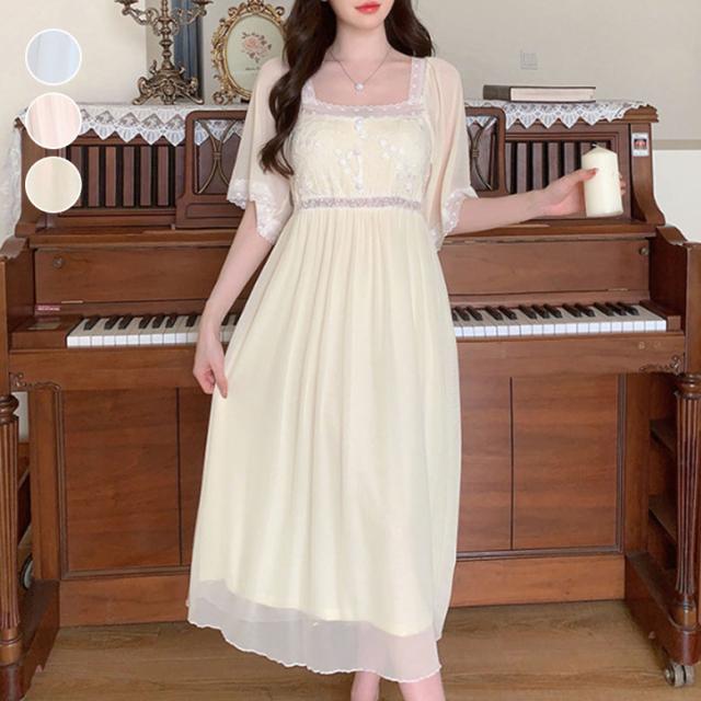 2C10 パジャマ レディース 春 夏 ワンピースパジャマ ネグリジェ 可愛い お洒落 ガーリー お姫様風 メッシュパジャマ レース パッド付き リラックス パジャマパーティー お泊り会 韓国 寝間着