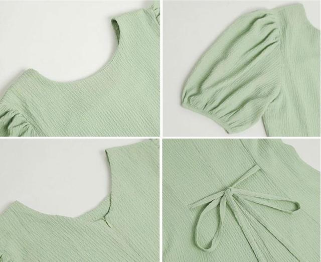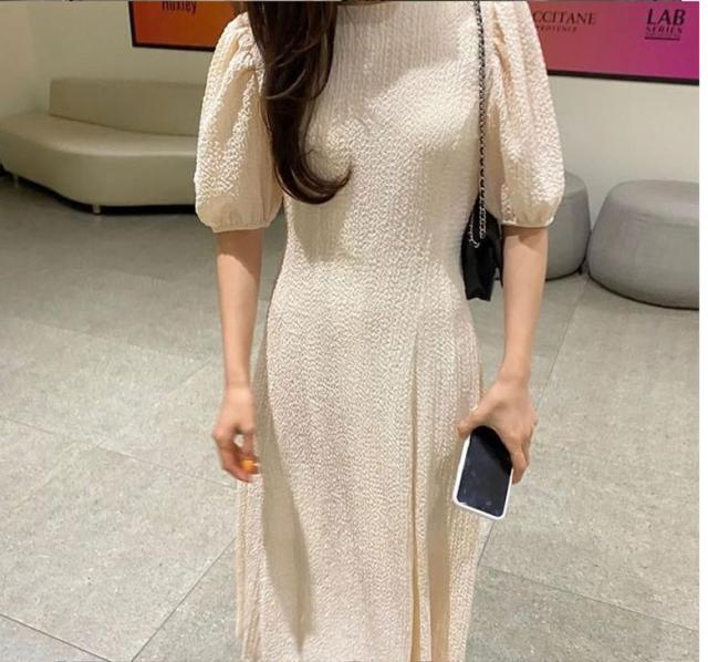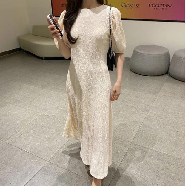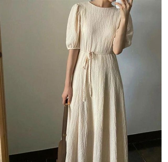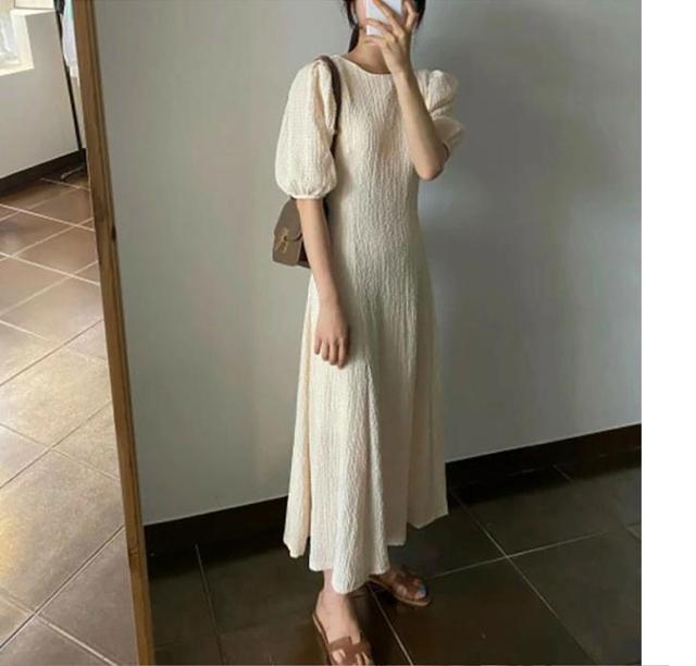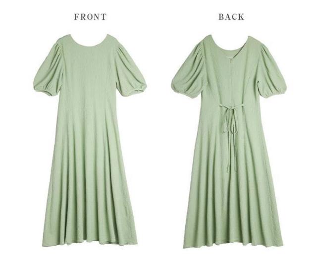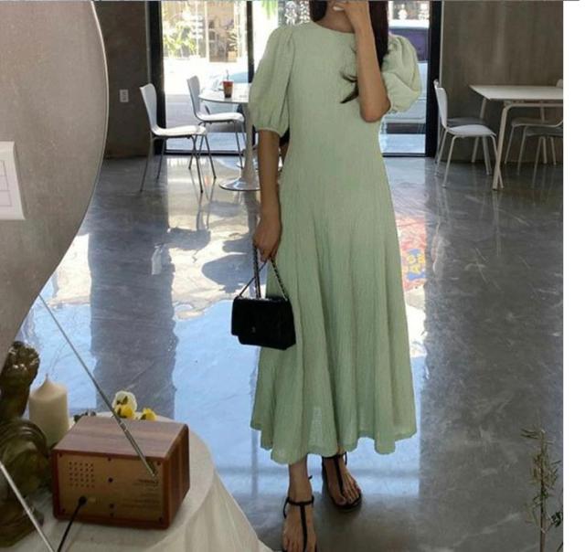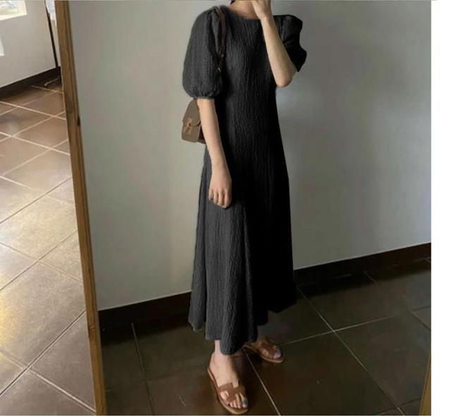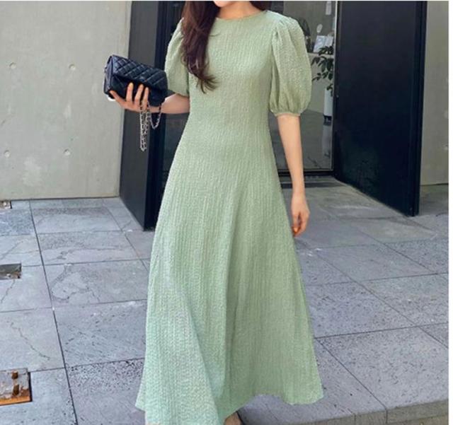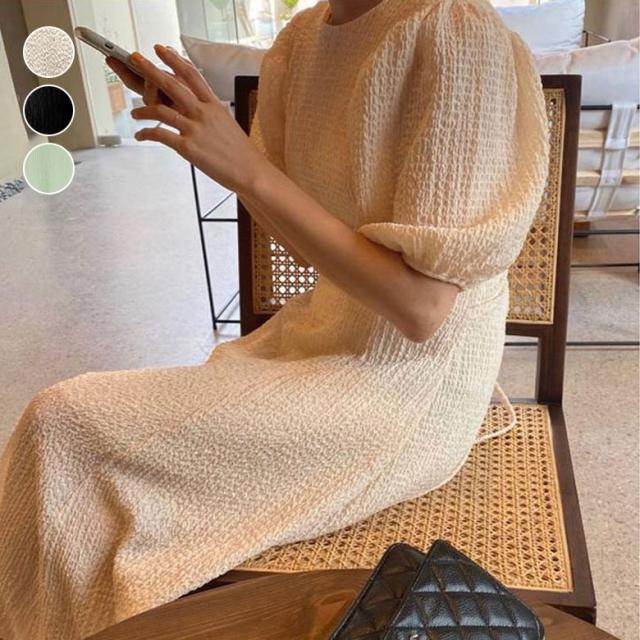 ワンピース 半袖 レディース 夏 ロングワンピース ラウンドネック ボリュームスリーブ 無地 シンプル カジュアル お洒落 きれいめ 半袖ワンピース ワンピ 韓国ファッション 大人