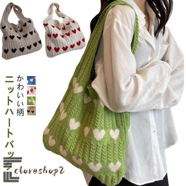 ケーブル編み カジュアル 軽量 ハート 編みバッグ 大容量 ニットバッグ 大きめ ショルダー バッグ エコバッグ 可愛い ニットバッグ おしゃれ 肩掛
