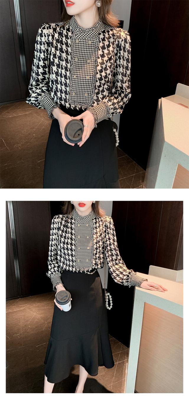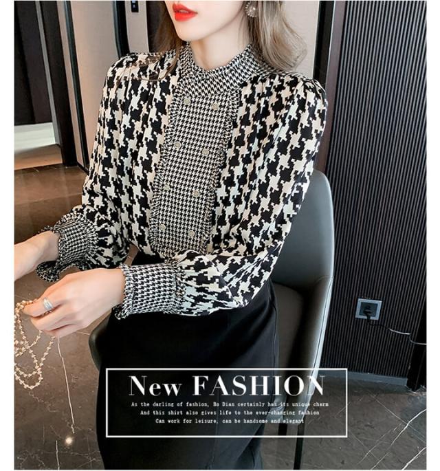 2A34スタンドカラーブラウス 千鳥柄 レディースファッション 続々登場 S M L XL