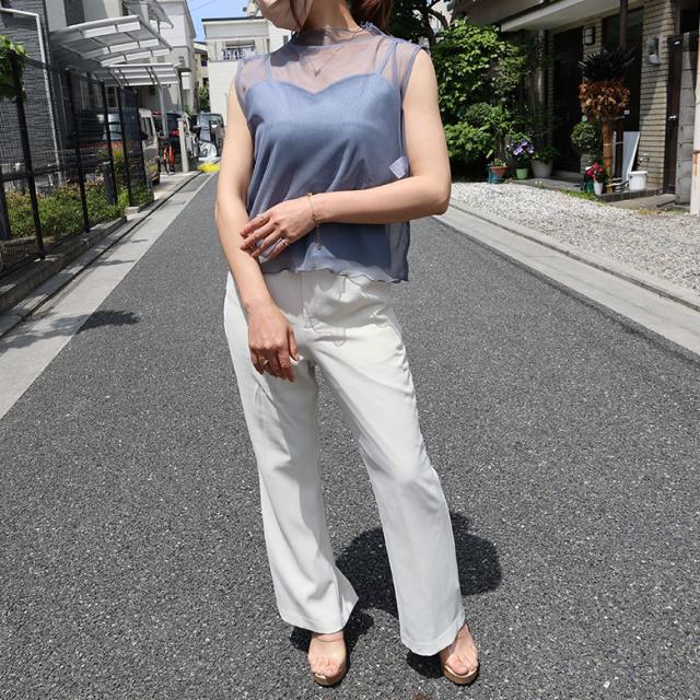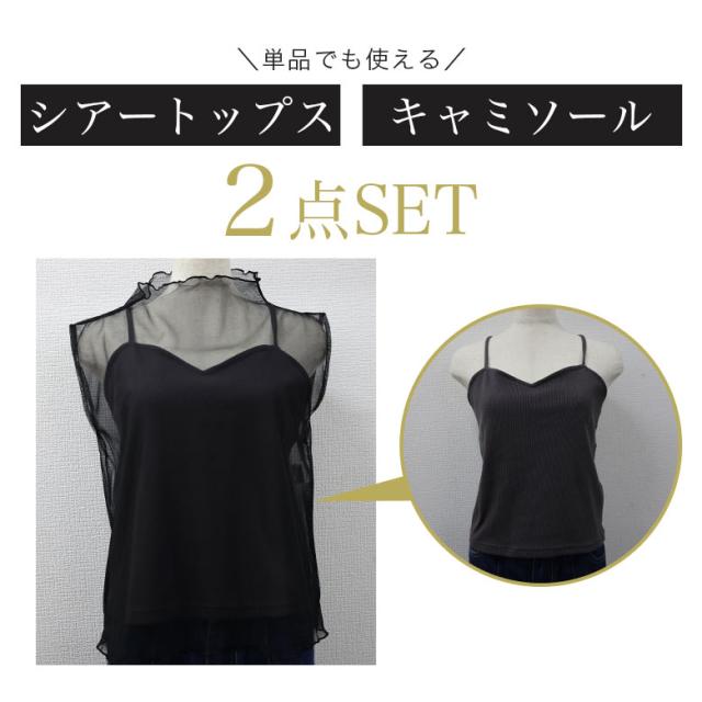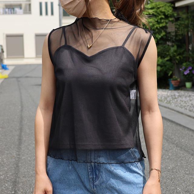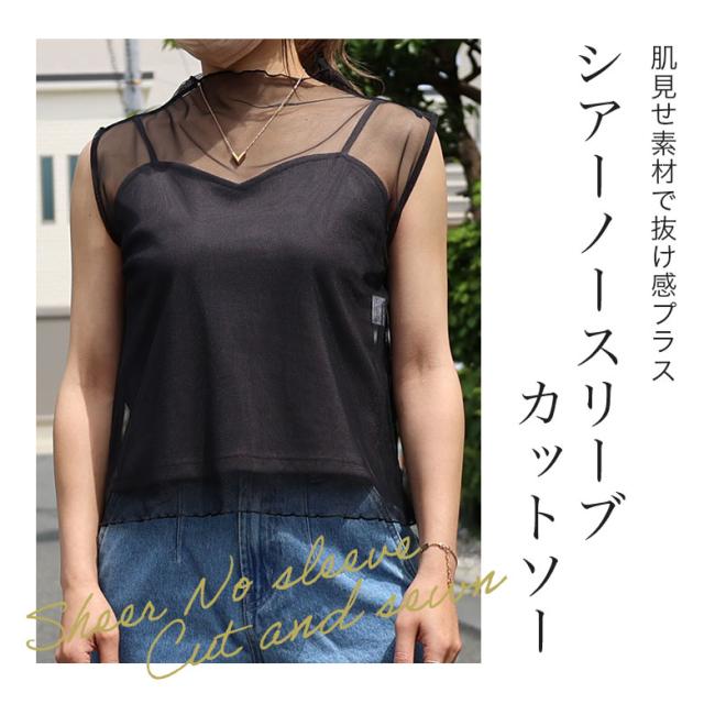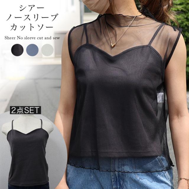 2B30 キャミソール付き、シアー ノースリーブ カットソー 2点セット レディース トップス セット 春 夏 透け感 重ね着 オシャレ シアー素材 涼し気 カジュアル レイヤード 韓国ファッ 肌見せ