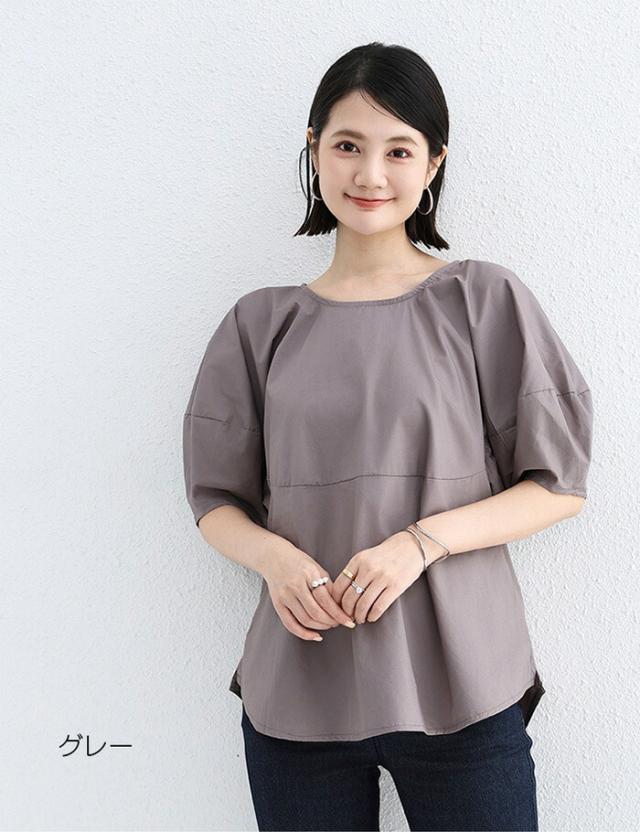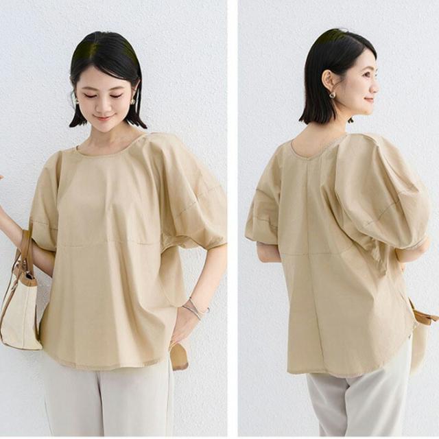ふっくらとしたボリュームスリーブやフロントの切り替えが特徴的なオーバーブラウス。