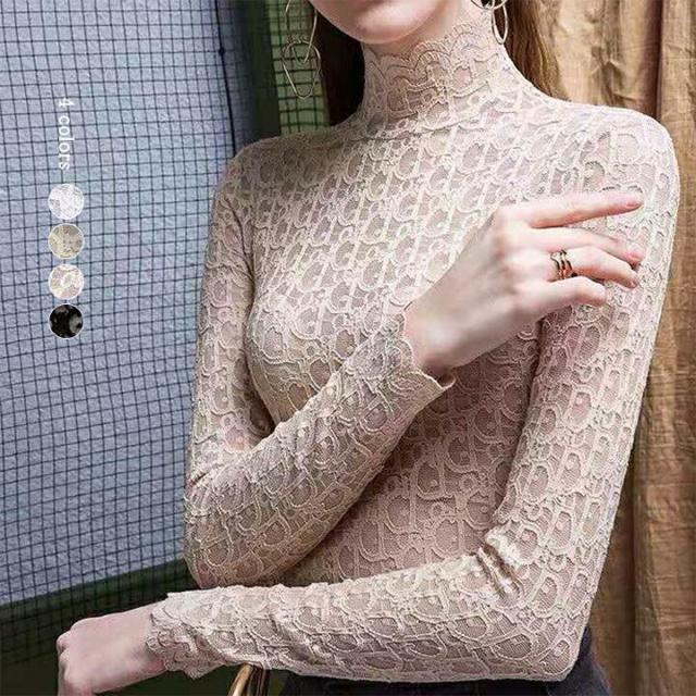 1A21 シースルートップス レディース ハイネック インナー 長袖 シースルーチュールレーストップス 長袖メッシュ 柔らかい ブラウス セクシー 可愛い 重ね着 薄手 レター シャ 透け