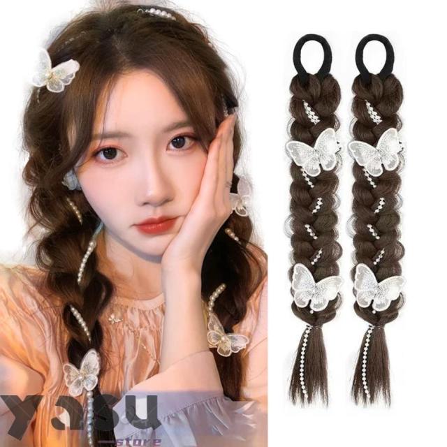 ヘアエクステ 三つ編み ウィッグ パール カラーエクステ 編み込み エクステンション ポニーテール ウィッグ ツインテール エクステ 蝶のヘアピン ヘアアクセサリ