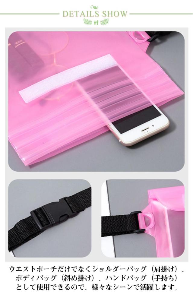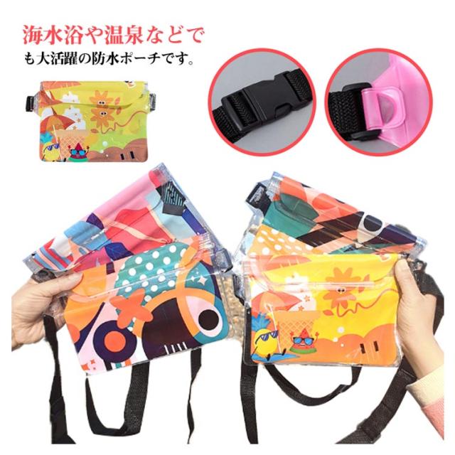 | 海水浴や温泉などでも大活躍の防水ポーチです。 大きめサイズなのでスマホだけじゃなく、お財布やカギ、時計などを入れることができる防水ケース。 見た目以上にたっぷり入る収納力!スマホや財布(二つ折り)・鍵などの貴重品の他に タバコや眼鏡なども!外出時の必須アイテムを全てまとめることができます。 ウエストポーチだけでなくショルダーバッグ(肩掛け)、ボディバッグ(斜め掛け)、ハンドバッグ(手持ち)として使用できるので、様々なシーンで活躍します。 あなたが楽しい時間を過ごしている間、水や汚れからしっかりとガードします。 | |