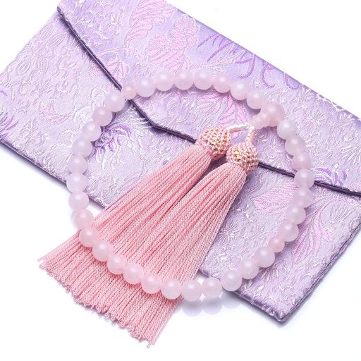 【落ち着いたピンク】色はピンクですが、落ち着いたピンクです。渋い数珠を嫌がる10代20代などの若い方に特におススメしますが、愛らしくエレガントな数珠をお望みの年配の方にももちろん最適です。