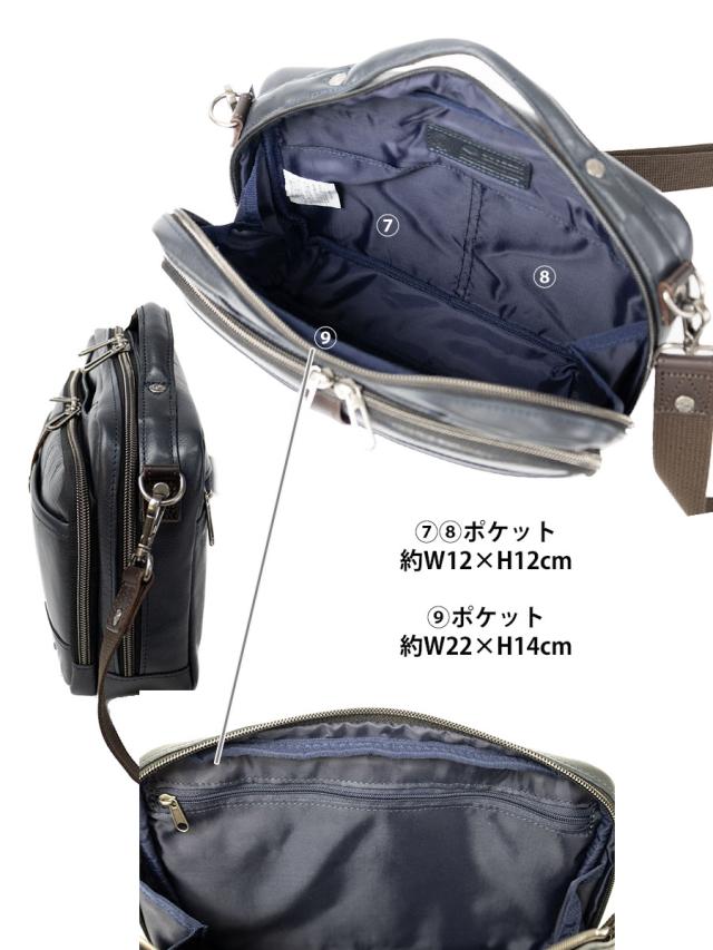 外ポケットが6、内ポケットが3、合計9ポケットできっちり収納できる牛革ショルダーバッグです。手提げとショルダーの2WAYでお持ちいただけます。