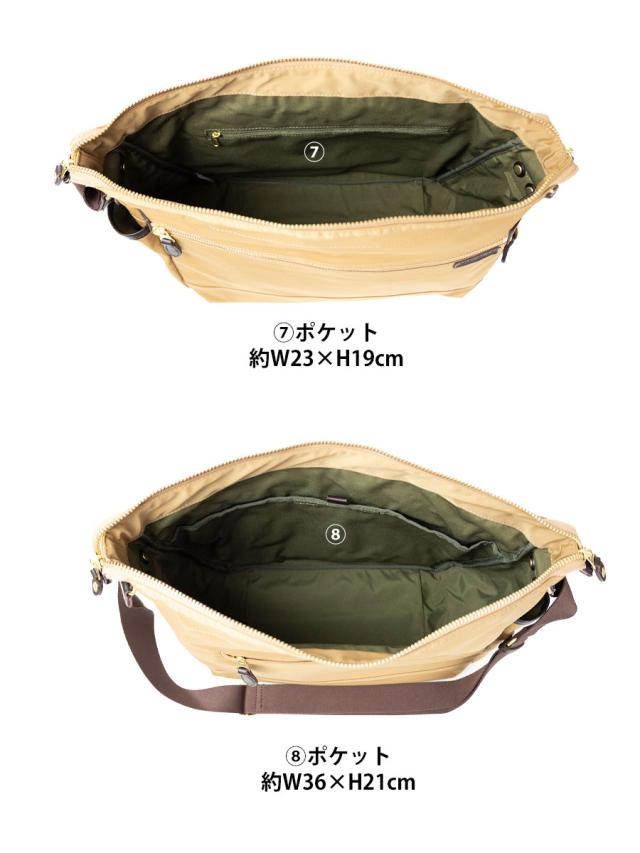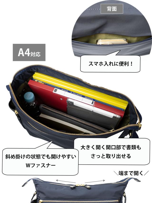 開口部は大きく開き、どの方向に掛けていても取り出しやすいWファスナー。A4ファイルもすっと取り出せます。豊富なポケットで鍵などの小物やスマホの収納に便利。ポケットは主張せずすっきりとしたデザインになっています。