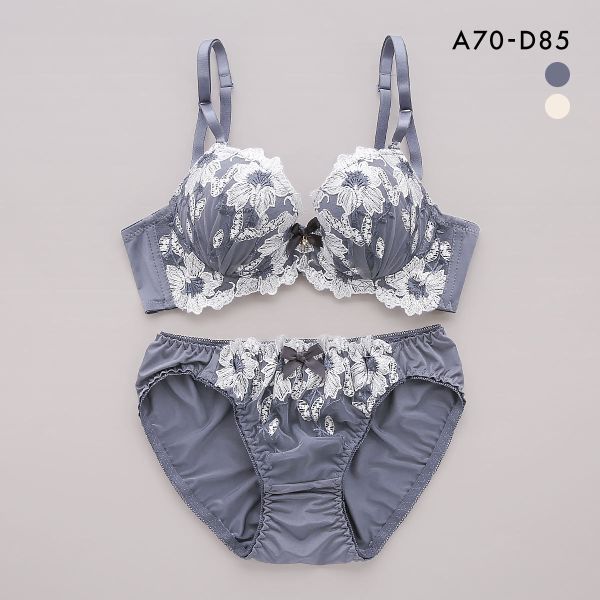 たっぷりの盛り感のある刺繍で美しく仕上げた、しとやかで洗練されたブラセット。光沢のある花びらがカップに浮かび上がる華やかなデザインです。