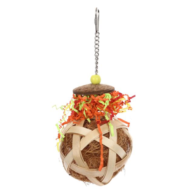 細い竹で編んだかごに、カラフルな短冊状の紙がギッシリ詰まった鳥用おもちゃです。餌や巣材を探したり、虫を突いたりする本能を刺激します。自然素材でできているので、つっついても、噛んでも、かじっても安全です。