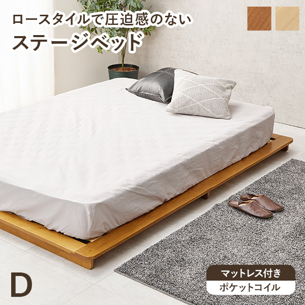 ベッド すのこ ダブル ステージベッド マットレス マットレス付き ベット すのこベッド 天然木 ロータイプ ベッドフレーム 木製 ポケットコイル ベットフレーム 一人暮らし ローベッド ダブルベット