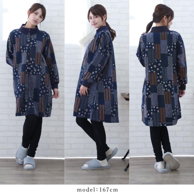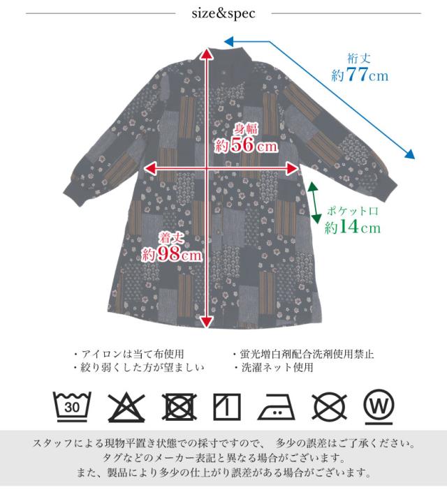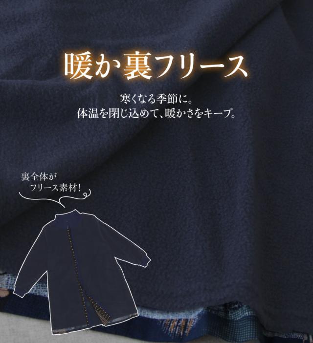 あったか裏フリースの和柄かっぽう着です。優れた保温性で体温を閉じ込め暖かさをキープしてくれます。ゆったりサイズに前開きなので、中に厚着していても着脱がしやすいです。落ち着いた和柄のデザインはギフトやプレゼントにもおすすめです。