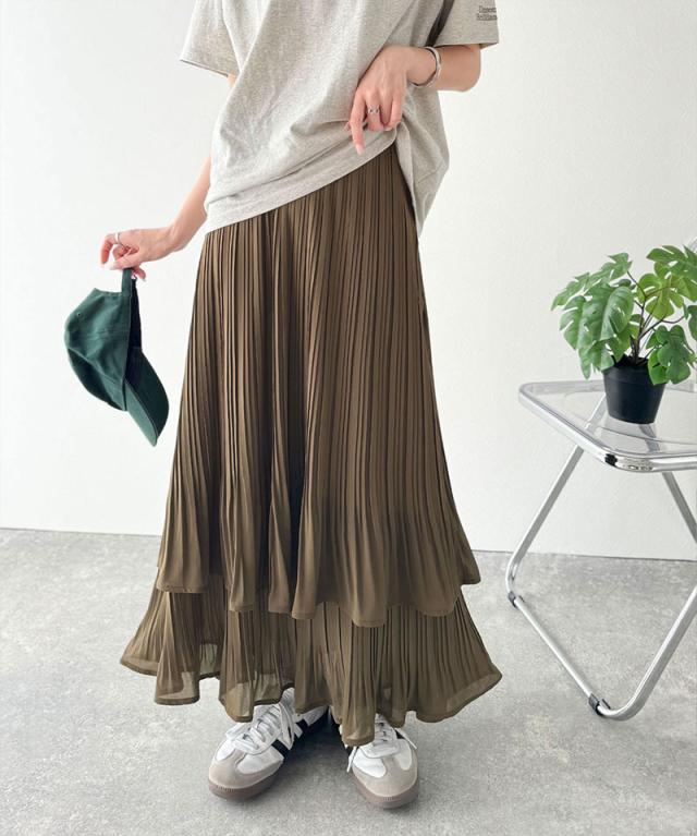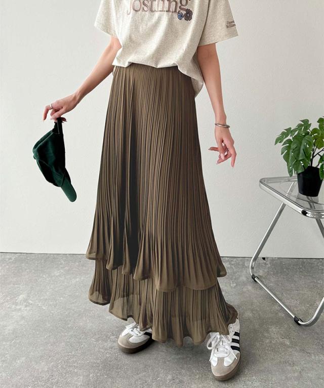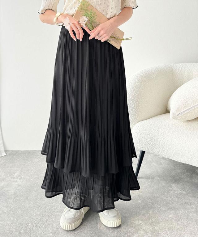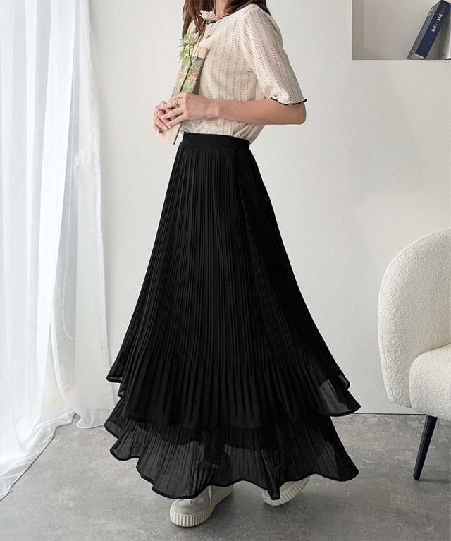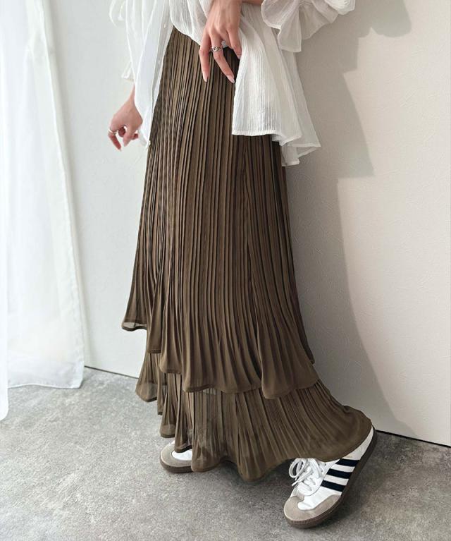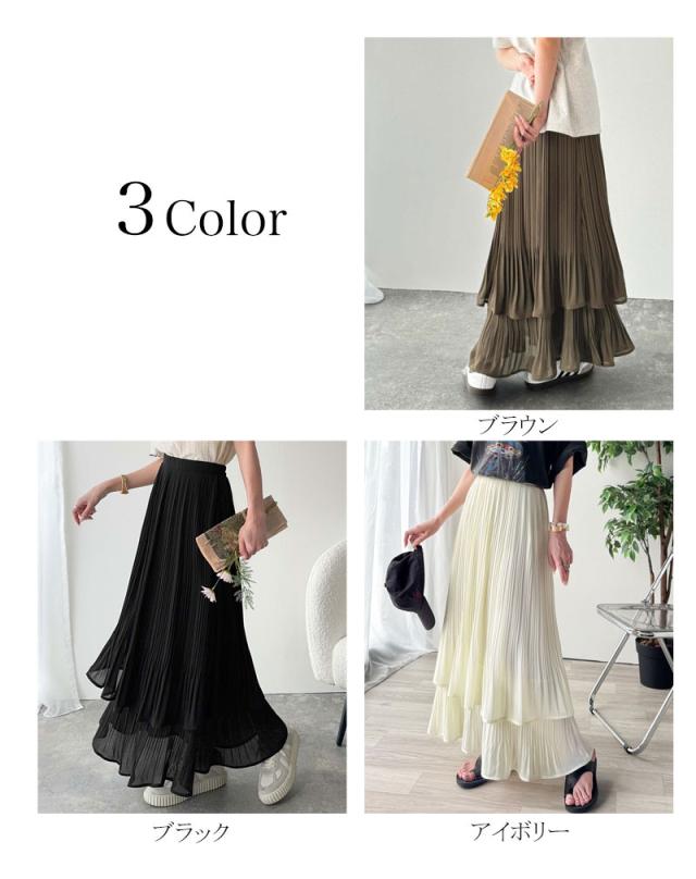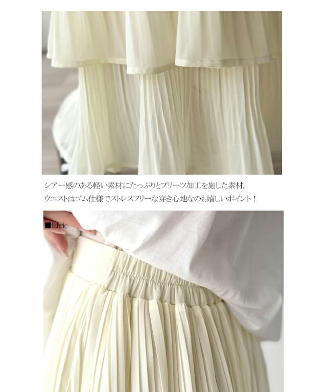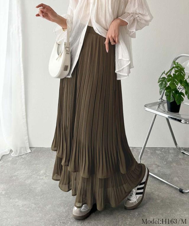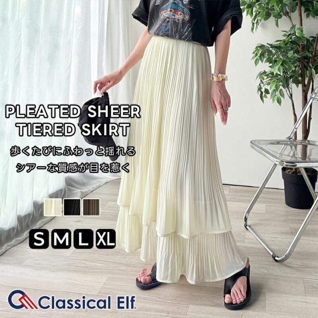 クラシカルエルフ秋新作 ボトムス スカート レディース プリーツ シアー 素材 ティアード ロング丈 Aライン ゆらり マーメイド シルエット ウエスト ゴム 仕様 大きいサイズ 2025ss ce1360003