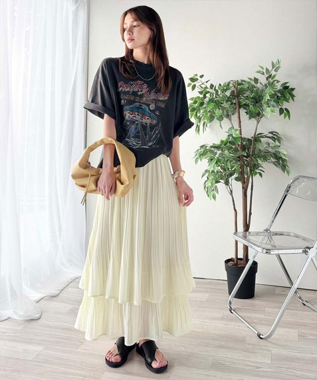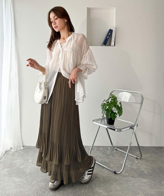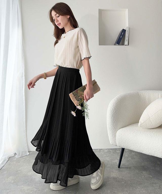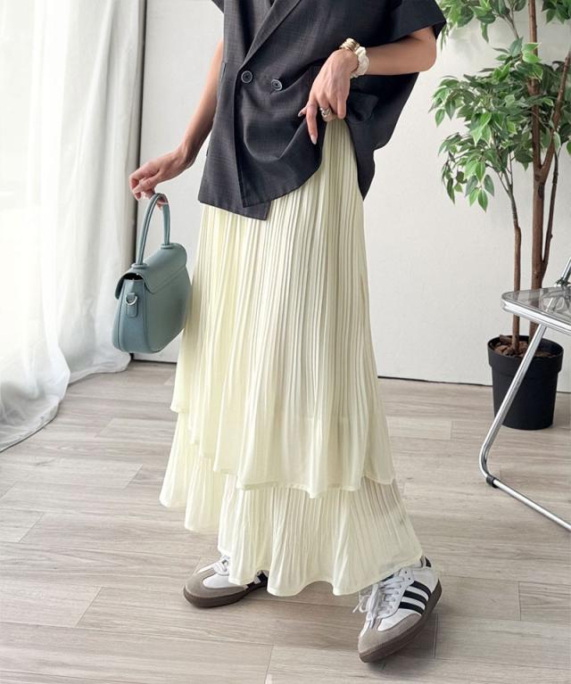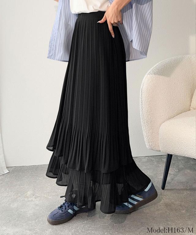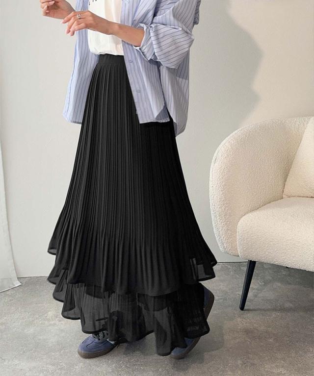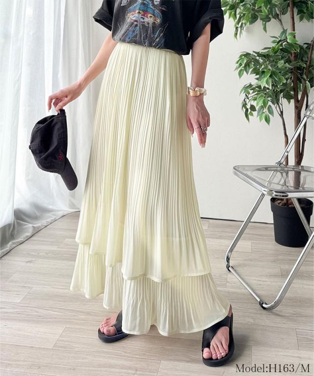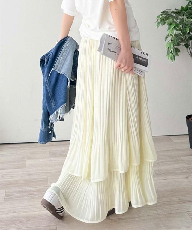 クラシカルエルフ秋新作 ボトムス スカート レディース プリーツ シアー 素材 ティアード ロング丈 Aライン ゆらり マーメイド シルエット ウエスト ゴム 仕様 大きいサイズ 2025ss ce1360003