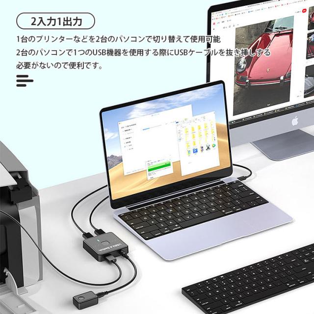 2台のパソコンで1つのUSB機器を使用する際にUSBケーブルを抜き挿しする必要がないので便利です。
