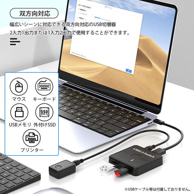 双方向対応で2台のパソコンで1つのUSB機器を切り替えたり、2つのUSB機器を1台のパソコンで切り替えたりできます。