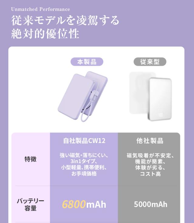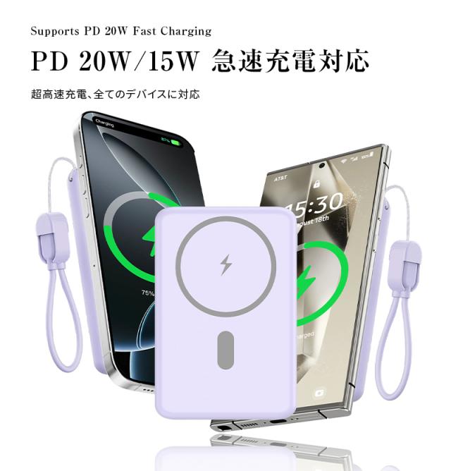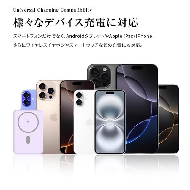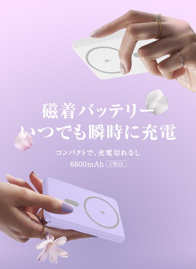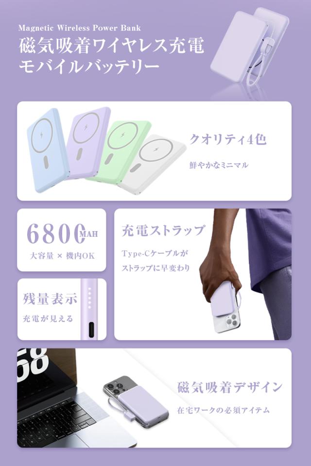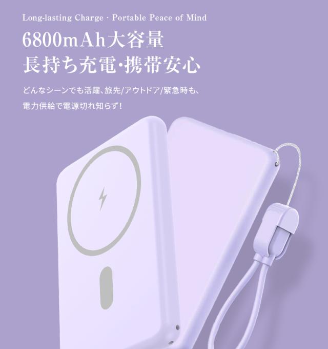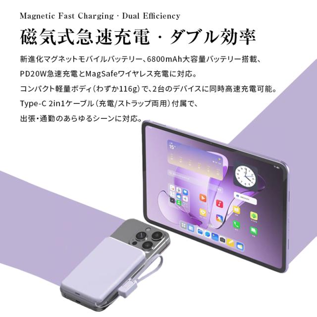 モバイルバッテリー 6800mAh 26.18Wh大容量 マグネット式 15Wワイヤレス充電器 ケーブル不要 2台同時充電 PD20W 急速充電 iPhone17/16充電 iOS/Android対応 Type-C入/出力 互換性抜群 小型軽量 コンパクト 防災グッズ PSE認証 90日あんしん保証付【PL保険加入済み製品・安心】
