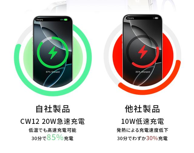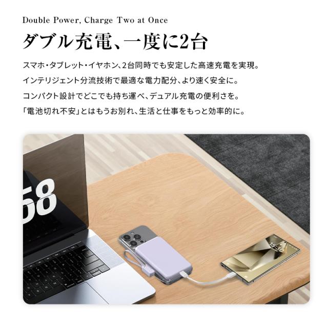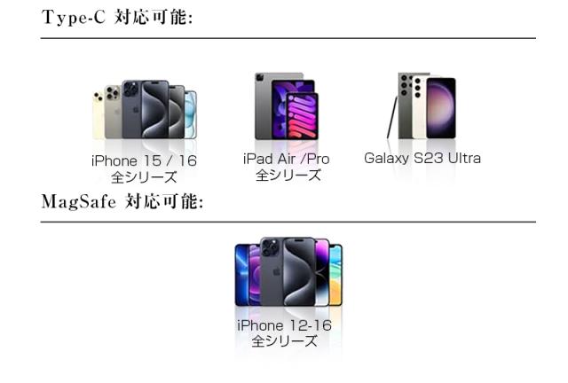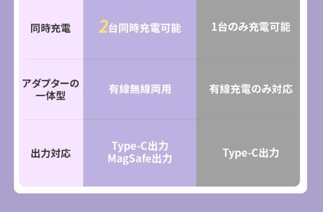 有線(Type-C)とワイヤレスのハイブリッド出力デザインにより、2台のデバイスの同時充電が可能です。15Wワイヤレス充電しながら、Type-C出力ポート(PD20W)でタブレット、スマホなどを別途充電でき、多様なニーズに対応。