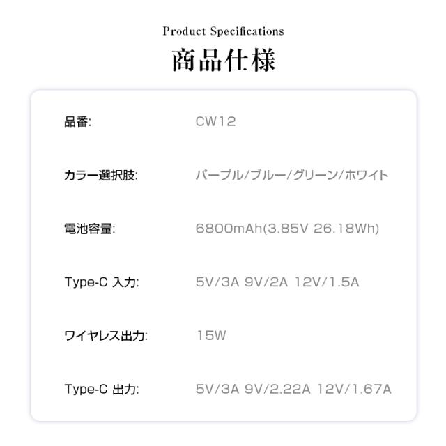 Type-C出力:DC 5V=3A/9V=2.22A/12V=1.67A