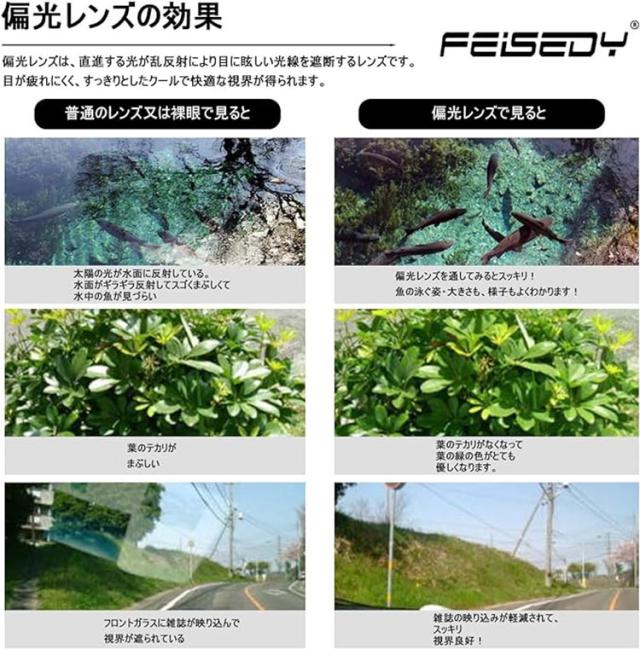 高品質の偏光レンズはUVA・UVB・UVC等の有害光を99%カットし、可視光しか通しません。あなたの眼を紫外線や乱反射光から守ります。 雪天気、雨天、曇りの日に強烈に降り注ぐ日差し、雪面、路面、水面、からの照り返し、運転や釣り等でガラスやギラギラを効か的にカットし、クリアな視界を提供します 。