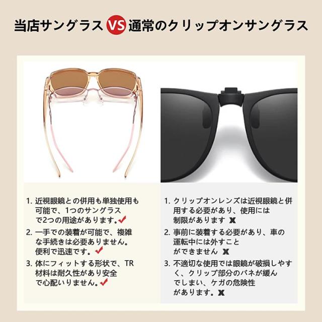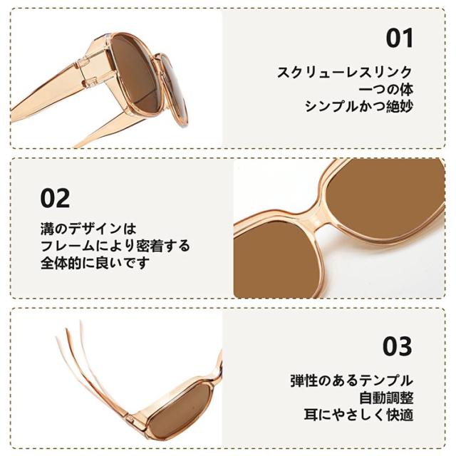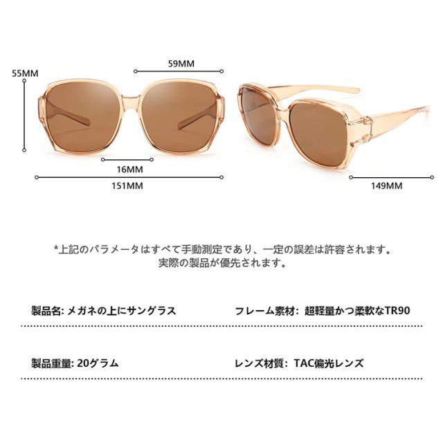 オーバーサングラスとはメガネの上に掛けられる機能的なサングラスです。メガネの上からはもちろん 、メガネなしでも直接掛けることができます。いろいろなサイズのメガネに合うために、レズン特大なTAC偏光を採用しました、近視、遠視、老視の眼鏡かけた人もご利用できます。二重メガネ(メガネ+サングラス)を掛けても、違和感がなく、逆に掛ける人がおしゃれなオーラがさしているようなかっこいいサングラスです。